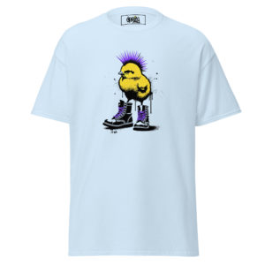 Un poussin jaune, une crĂȘte violette, des rangers noires.